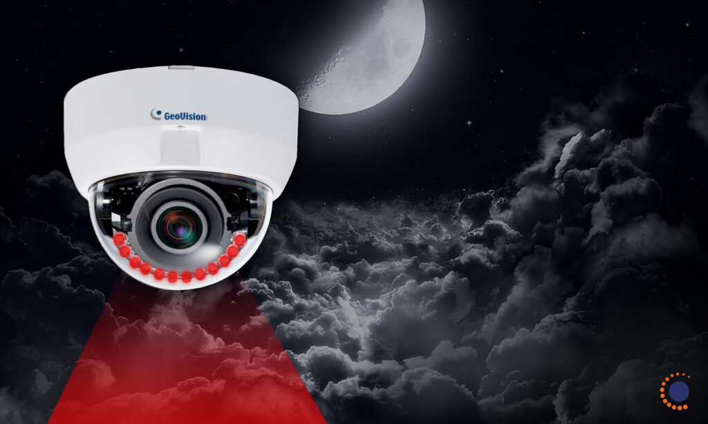 Nowadays almost all CCTV security cameras come with built-in IR LED lights that enable the camera to see into the dark and record black and white videos. These lights are infrared type and their illumination can be seen by the camera’s sensor only. With the naked eye, it will look dimly red.