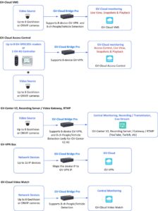 GV-Cloud Bridge Pro از انواع حالتهای عملیاتی پشتیبانی میکند، از جمله اتصال دوربینهای معمولی به GV-Cloud VMS برای نظارت بر ابر، GV-Center V2 برای نظارت مرکزی، و GV-Recording Server / Video Gateway برای ضبط و انتقال ویدیو در مقیاس وسیع. علاوه بر این، امکان اتصال خوانندهها یا یک کنترلر واحد به سیستم کنترل دسترسی GV-Cloud برای مدیریت دسترسی مبتنی بر ابر را فراهم میآورد.